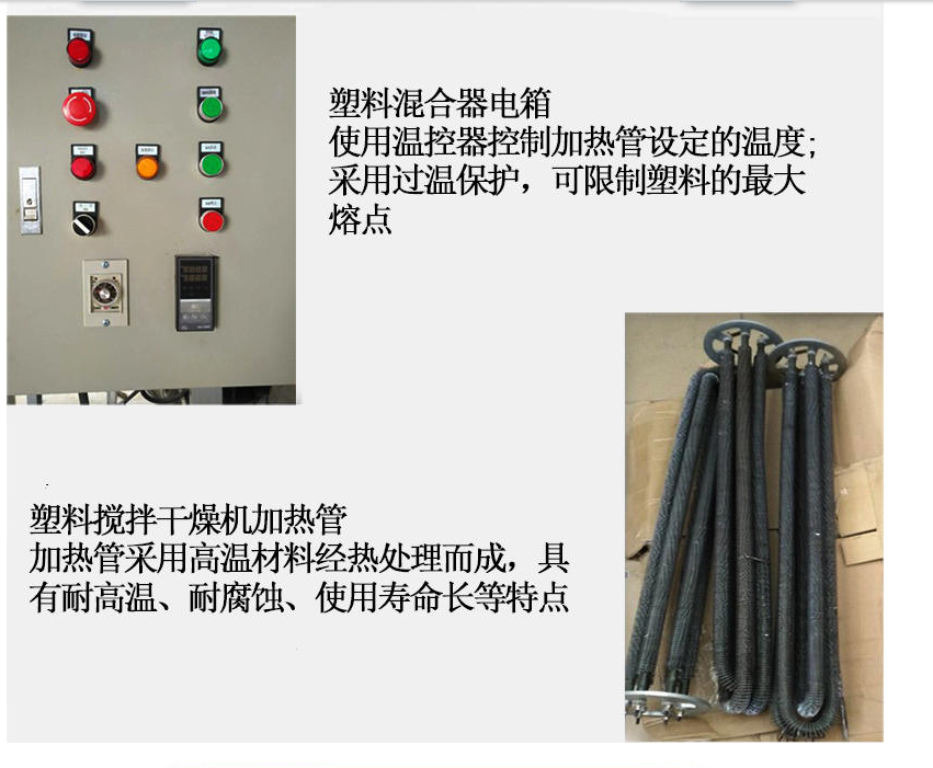 8、干燥混合功能二合一,但不需要干燥時,只需將“加熱開關(guān)”及“風(fēng)機(jī)開關(guān)”關(guān)閉,本系列機(jī)型即可用于塑料攪拌均化用途,一機(jī)二用;